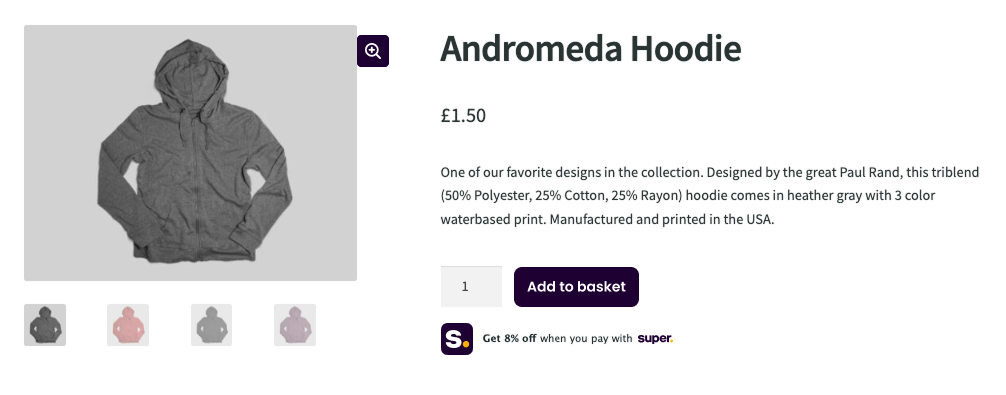 Adding Super below the "Add to Basket" Call To Action (CTA) reminds customer of the value of using Super to pay later on at your checkout.