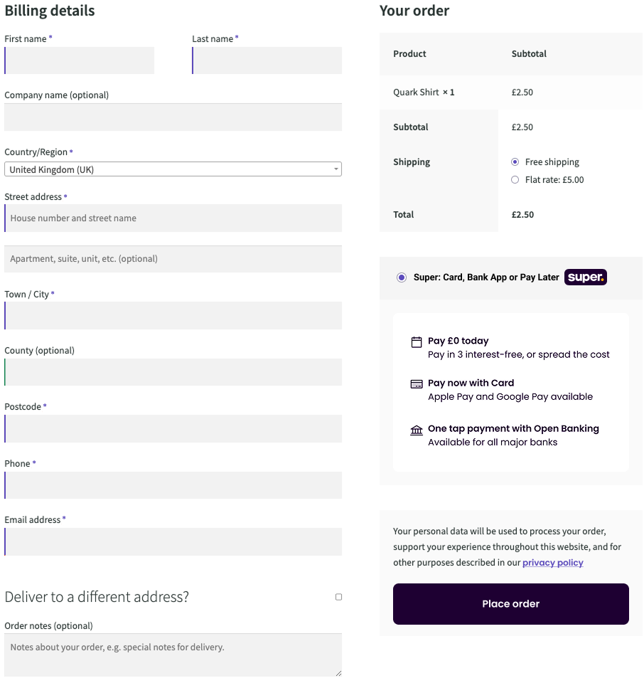 Sitting alongside other expected checkout methods such as Visa, Mastercard and Paypal will promote awareness of Super across your entire store.