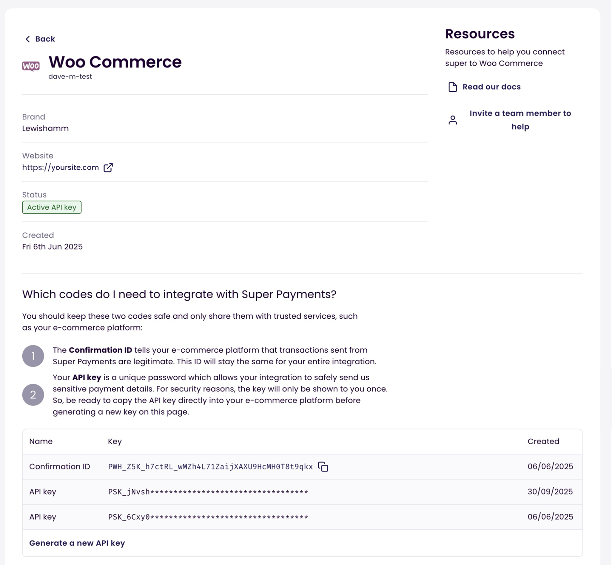 Generate your API keys in your business portal. You'll need your Confirmation ID and API key when you add your Super Payments plugin in the WooCommerce admin interface. These keys keep your payments safe and secure.